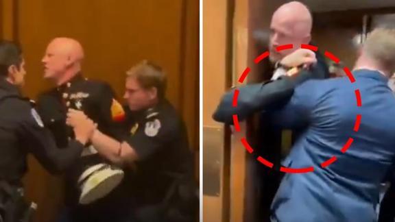 ABD polisi, İran'a saldırıları Kongre binasında protesto eden eski Deniz Piyade Çavuşu Brian McGuinness'i gözaltına almaya çalışırken kolunu kırdı.