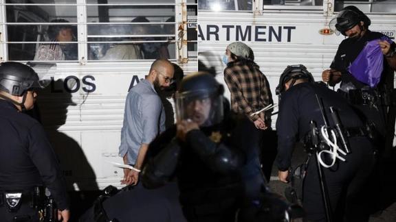 Göstericiler şehir merkezinde araçları ateşe verdi, kolluk kuvvetleriyle çatıştı. Los Angeles Belediye Başkanı Karen Bass pazartesi gecesi "marjinal grupların" gerçekleştirdiği protestolarda 100'den fazla kişinin gözaltına alındığını açıkladı.