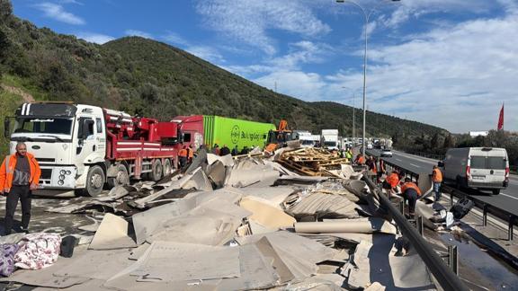 Kazada devrilen tırın sürücüsü Selami D. yaralandı. Tırdaki mukavvalar yola saçıldı.
