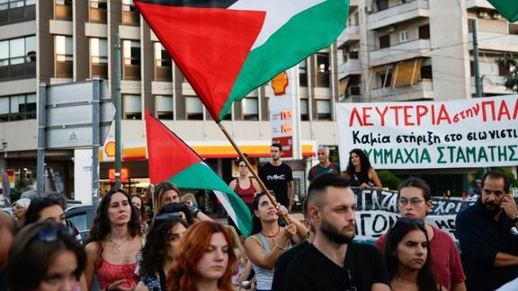 Sağlık sektöründeki sendikaların ortak çağrısıyla sağlık çalışanları, İsrail'in Atina Büyükelçiliği önünde bir araya geldi.