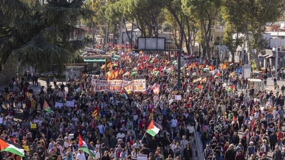 Protestocular, "Gazze'de soykırımı durdurun", "İsrail'e silah göndermeyi durdurun", "Gazze'nin bombalanmasını durdurun", "İsrail'le anlaşmaları durdurun" yazılı dövizler açtı.