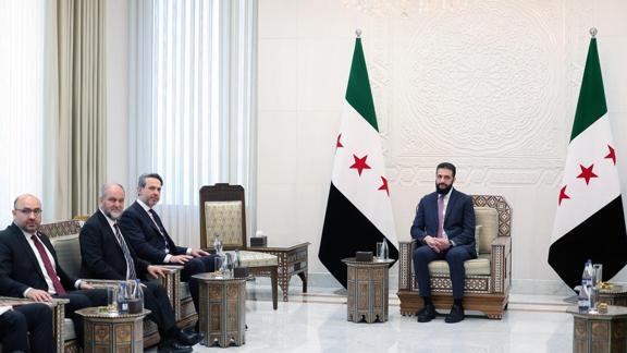 Cumhurbaşkanı Ahmed Şara, Şam'da resmi temaslar gerçekleştiren Enerji ve Tabii Kaynaklar Bakanı Alparslan Bayraktar ve beraberindeki heyetle Halk Sarayı'nda bir araya geldi.