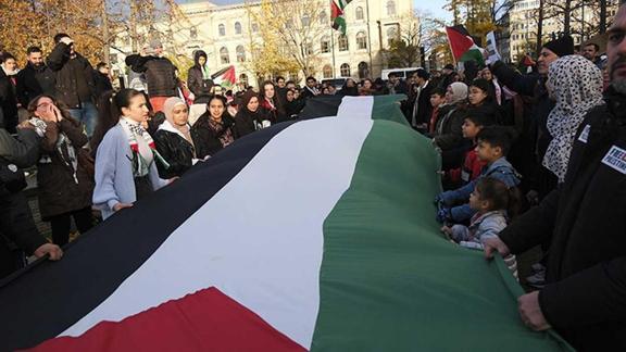 Yaklaşık 60 kişiden oluşan göstericiler, üzerinde "Barış mümkündür", "İsrailliler ateşkesten yana şimdi", "İsrailliler etnik temizliğe karşı", "Gazze'deki katliamı durdurun", "Herkes için insan hakları" ve "Sadece barış güvenliği getirebilir, askeri çözüm değil" yazan pankart ve dövizler taşıdı.