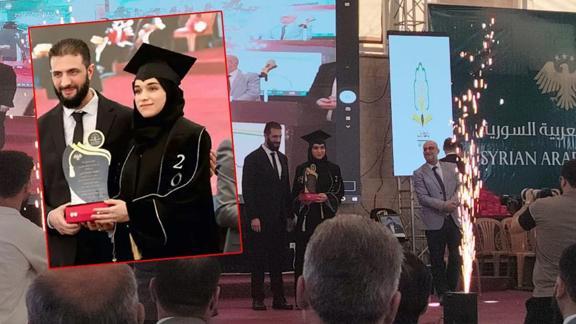 Düzenlenen mezuniyet töreninde konuşan Latife el Durubi, eğitim hayatında kendisine destek olan Cumhurbaşkanı Ahmed Şara'ya teşekkür etti.
