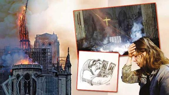 Paris’teki 850 yıllık Notre Dame Katedrali’nde restorasyon sırasında kimyasal maddelerin tutuşarak çıktığı öne sürülen yangın 8.5 saat sonra söndürüldü. Yangında 93 metre yüksekliğindeki ana çan kulesi ve yapının çatısı tamamen çöktü. Yoğun çalışma sayesinde kuzey çan kulesi ile ana bina kurtarıldı. Katedralin ana yapısının ‘korunduğu’ ve ‘kurtarıldığı’ bildirildi. Paris Başsavcısı Remy Heitz, yangının kasıtlı çıkarıldığına dair bir işarete ulaşmadıklarını söyledi. Fransa Cumhurbaşkanı Emmanuel Macron katedrali “hep birlikte yeniden inşa edeceklerini” söyledi. Fransız milyarderler Bernard Arnault ve François-Henri Pinault yeniden inşa çalışmaları 300 milyon euro bağışladı. Dünya kentlerinden de bağışlar yağdı. Dün itibarıyla 700 milyon euroyu bulan yardımlara ek olarak Avrupa Parlamentosu da bir yardım fonu kurdu.