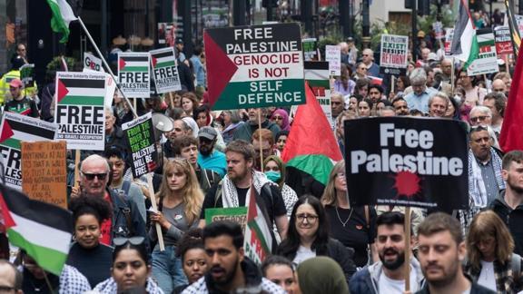Yaklaşık 250 binden fazla insanın katıldığı yürüyüşte protestocular "Özgür Filistin", "Nehirden denize Filistin özgür olacak" ve "Rishi Sunak saklanamazsın, seni soykırımla yargılayacağız" sloganları attı.