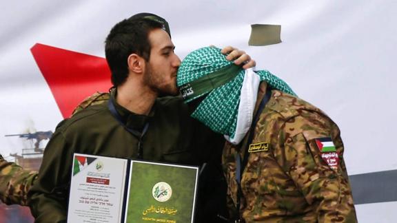 İsrailli esirlerden Omer Shem-Tov'un, serbest bırakılmadan önce platformda Kassam Tugayları savaşçılarının başını öpmesi dikkati çekti.