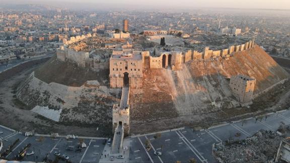 Rejim karşıtı silahlı grupların kontrolüne geçen kent merkezindeki Halep Kalesi'nin ön duvarında asılı olan Devlet Başkanı Beşşar Esed'in posteri indirildi.