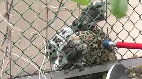 Bir başka videoda ise parkta sıkışan leoparın sopalarla yakalanması gösteriliyor. Çitlerin ardından sopayla leoparın sabitlendiği, arkasından da iki kişinin gelerek hayvanı etkisiz hale getirdiği görülüyor.