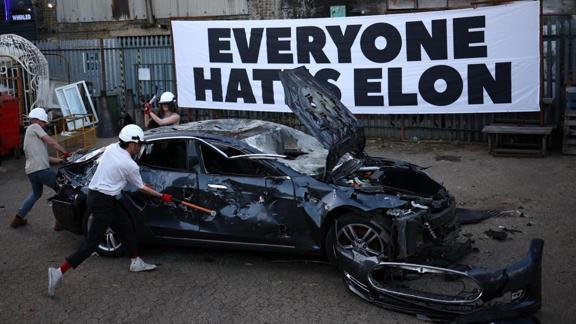 Elon MUsk'a tepki gösteren bir grup, ellerinde balyoz ve beyzbol sopalarıyla Tesla marka bir aracı parçaladı.
