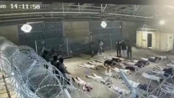 Kanal 12 televizyonunda yayımlanan görüntülerde, alıkonulan çok sayıda Filistinlinin tellerle çevrili bir yerde yüzüstü yerde yattıkları görülüyor.