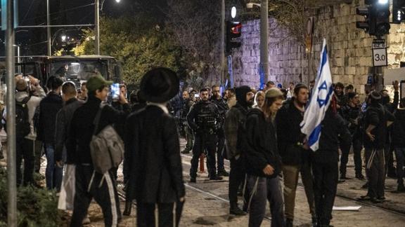 Öte yandan bir grup Yahudi yerleşimci ise, ellerinde "Geberin", "Gazze'ye gidin" şeklinde pankartlar taşıyarak hakaret edip göstericilere saldırdı. İki grup arasındaki arbede, polisin müdahalesiyle son buldu.