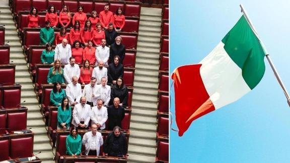 Parlamentonun alt kanadı Temsilciler Meclisi'ndeki oturumda kırmızı, siyah, yeşil ve beyaz renk kıyafetlerle Filistin bayrağı şeklinde oturan M5S milletvekilleri, Filistin bayrağının insanlık için mücadele edenlerin evrensel bayrağı haline geldiği mesajını verdi.