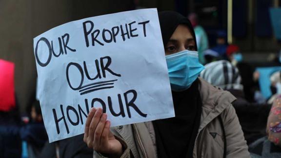 Göstericiler ellerinde, ‘’Peygamberimiz onurumuzdur’’, ‘’Müslümanları terörize etmeyi durdurun’’, ‘’İnançlara saygı’’, ‘’Biz tüm peygamberleri seviyoruz’’ ve ‘’Peygamberimize saygı’’ pankartları taşıdılar.
