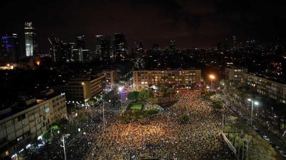 İsrail'in başkenti Tel Aviv'deki Rabin Meydanı'nda toplanan yüzlerce kişi, yeni tip koronavirüs (Kovid-19) salgınına rağmen hakkında yolsuzluk davası açılması nedeniyle Başbakan Binyamin Netanyahu karşıtı gösteri düzenledi.