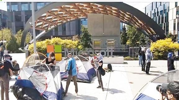 The Verge internet sitesinin haberine göre göstericiler, İsrail'in katliamlarına destek veren şirketin önüne çadır kurup, pankartlar açtı. Eylemde, şirketin bir binasına "Şehit Filistinli Çocuklar Plazası" yazılı pankart asıldı.
