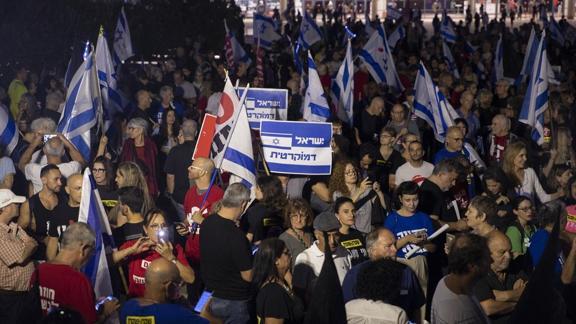 Tel Aviv'in Habima Meydanı'nda toplanan 500'den fazla İsrailli ellerinde "Aşırı sağcılara hayır" yazılı pankartlar ve Netanyahu karşıtı protestoların sembolü, siyah fontta İbranice "Hayır" yazılı afişler taşıdı.