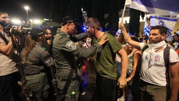 Netanyahu'nun konutunun önündeki bariyerleri aşmaya çalışan protestoculara müdahale eden polis, bazı göstericileri darbetti ve TOMA'dan pis kokulu su püskürttü.