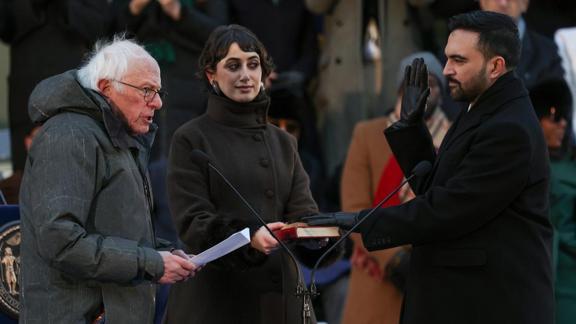 Seçim sürecinde genç Belediye Başkanı'nı açıktan destekleyen ABD Senatörü Bernie Sanders'in eşliğinde kürsüye gelen Mamdani, eşi Rama Duwaji'nin tuttuğu Kur'an-ı Kerim'e el basarak yemin etti.