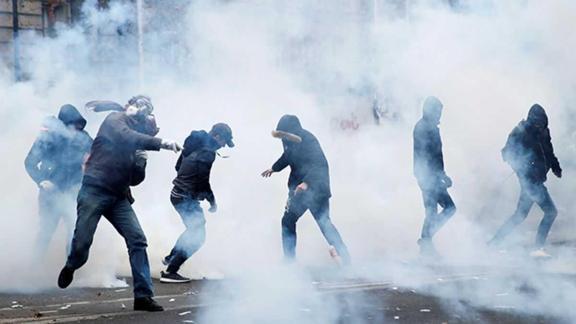 Başkent Paris'te yürüyüşün sonlanacağı "Nation" Meydanı'na doğru dağınık gruplar halinde yürüyen göstericilerle polis arasındaki arbede yer yer devam ediyor.