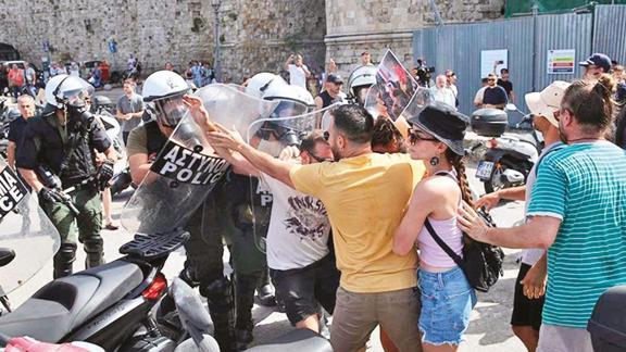 İsrailli turistleri taşıyan "Crown Irıs" kurvaziyeri dün Yunanistan'ın Rodos adasına geldi. Filistin halkına destek vermek isteyen bir grup, İsrailli turistlerin gemiden inmesini engellemek amacıyla limanda eylem düzenledi. Yaklaşık 100 kişilik gösterici grubu, ellerinde Filistin bayrakları ve Filistin'de ölen çocukların fotoğrafları ile eylem yaptı. Polis, "Filistin'e özgürlük" sloganları atan grubu limandan uzaklaştırırken, polis ve eylemciler arasında çıkan arbedede en az iki kişi gözaltına alındı.