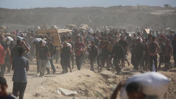 AA kameramanı, İsrail ordusunun, Gazze Şeridi'nin kuzeybatısındaki Zikim Sınır Kapısı yakınlarında insani yardım alabilmek için toplanan Filistinlilere yönelik saldırılarını görüntüledi.