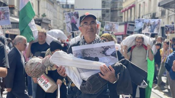 Filistin bayraklarının yanı sıra "Filistin'de barış" ve "Soykırımı durdurun, sessizlik öldürür" yazılı afişler taşıyan göstericiler, "Hepimiz Gazze'nin gazetecileriyiz" ve "İsrail katil, Macron (Fransa Cumhurbaşkanı) suç ortağı" sloganları attı.