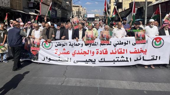 Göstericiler, Ürdün ile İsrail arasında 1994'te varılan Vadi Araba Barış Anlaşması'nın iptal edilmesini talep eden sloganlar attı ve "Siyonist soykırım suçlularıyla imzalanan Vadi Araba Barış Anlaşması iptal edilsin" yazılı pankartlar taşıdı.