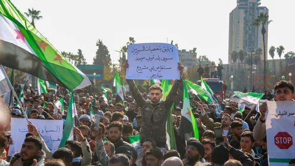 Gösterilerde, Suriye bayrakları taşınarak ülkenin birlik ve bütünlüğünü vurgulayan sloganlar atıldı, bölünme ve ayrılık çağrıları aleyhinde döviz ve pankartlar açıldı.