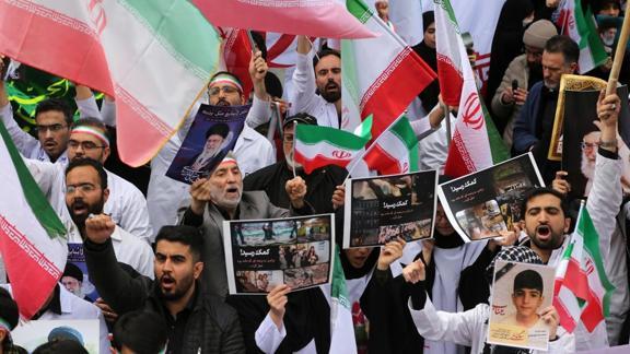 Tahran'da doktorlar ve tıp öğrencileri, Gandi Hastanesi önünde "İsrail ve ABD'nin sağlık merkezlerine yönelik saldırılarını" protesto etti.