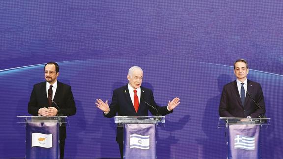 İsrail Başbakanı Binyamin Netanyahu, Yunanistan Başbakanı Kiryakos Miçotakis (sağda) ve GKRY lideri Nikos Hristodulidis hafta başında Tel Aviv'de görüşmüştü.