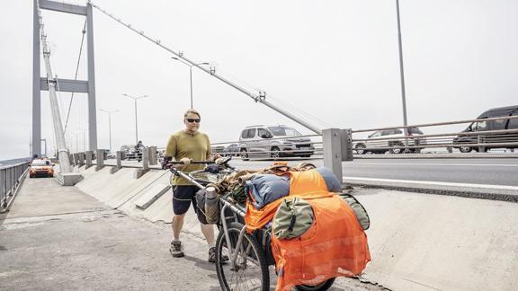 İngiliz gezgin Karl Bushby, kıtalararası yolculuğun yalnızca yürüyerek de yapılabileceğini kanıtlamak amacıyla 26 yıl önce Şili'den evine ulaşmak için yola çıktı. İstanbul'a gelen Bushby, Ulaştırma ve Altyapı Bakanlığı'nın özel izniyle dün sabah 10.30'da köprünün Anadolu yakasından yürüyüşüne başlayarak, yaklaşık 10 dakikada Avrupa yakasına ulaştı.