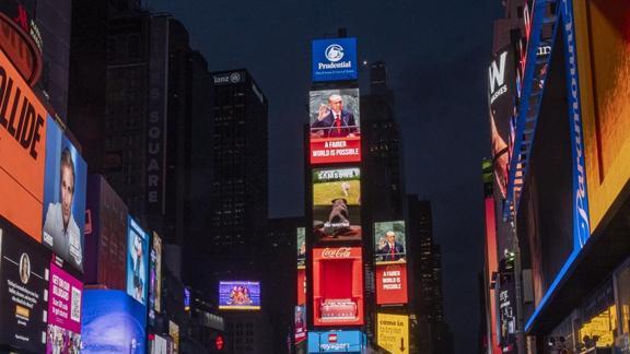 BM'nin 80. Genel Kurulu'nda dünyaya Gazze'yi haykıran Başkan Erdoğan'ın "Dünya 5'ten büyüktür" ve "Daha adil bir dünya mümkün" sözleri, New York'un merkezindeki cadde ve sokaklar ile Times Meydanı'ndaki led ekranlara yansıtıldı.