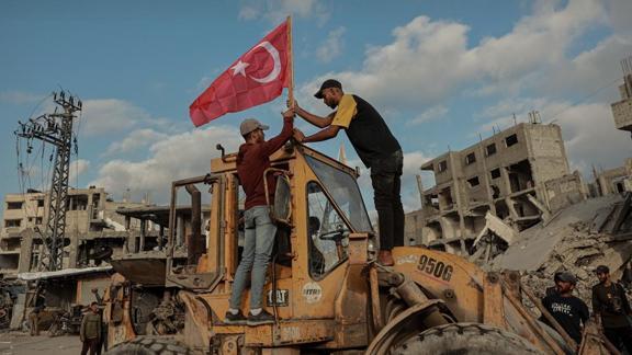 Gazze'de enkaz kaldırma çalışmaları sırasında buldozerlerdeki Türk bayrağının dalgalandığı anlara atıfta bulunulan analizde, şunlar kaydedildi: