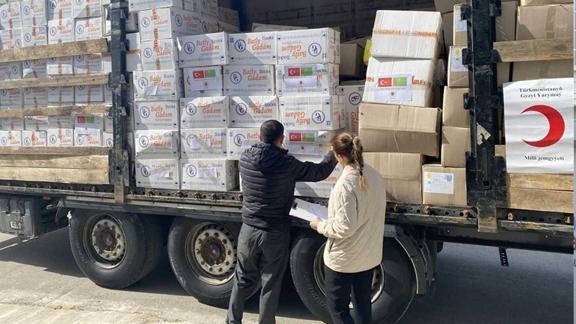 Türkmenistan Kadınlar Birliğinden yaklaşık 4,1 ton gıda, Kızılyarımaydan ise hijyen malzemeleri, giysi ve gıdadan oluşan 6,8 ton insani yardım tırla deprem bölgesine gönderildi.