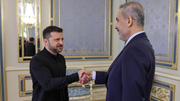 Dışişleri Bakanı Hakan Fidan'ı Kiev'deki çalışma ofisinde kabul eden Zelenski, Telegram hesabından görüşmeye ilişkin paylaşım yaptı.