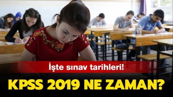 2019-KPSS Genel Yetenek-Genel Kültür ile Eğitim Bilimleri, 14 Temmuz'da KPSS Alan Bilgisi Sınavları 1. oturumu (Kamu Yönetimi, Uluslararası İlişkiler, Çalışma Ekonomisi ve Endüstri İlişkileri) ile KPSS Alan Bilgisi Sınavları 2. oturumu (Hukuk, İktisat, Maliye) 20 Temmuz'da, KPSS Alan Bilgisi Sınavları 3. oturumu (İşletme, Muhasebe, İstatistik) 21 Temmuz'da, Öğretmenlik Alan Bilgisi Testi (ÖABT) ise 28 Temmuz'da uygulanacak.