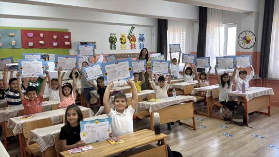 Bazı ailelerin de çocuklarının heyecanına eşlik ettiği karne törenlerinde öğrenciler, bir sonraki eğitim öğretim döneminde buluşmak üzere öğretmenleriyle vedalaştı.