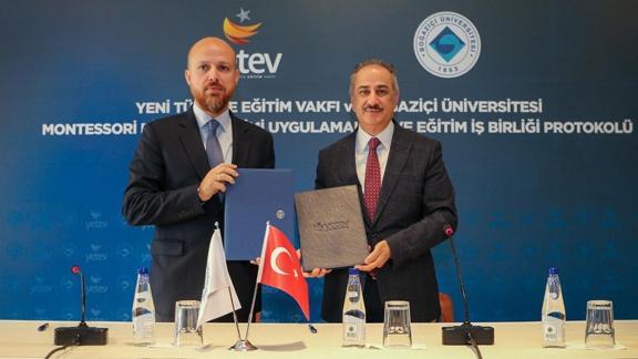 Yeni Türkiye Eğitim Vakfı (YETEV) ile Boğaziçi Üniversitesi arasında, "Montessori Eğitmen Eğitimi Uygulamaları ve Eğitim İş Birliği Protokolü" imzalandı. Boğaziçi Üniversitesi Rektörlük Toplantı Salonu'nda yapılan protokolün imza törenine; YETEV Mütevelli Heyeti Başkanı Necmeddin Bilal Erdoğan, Boğaziçi Üniversitesi Rektörü Prof. Dr. Naci İnci, YETEV Okulları Genel Müdürü Hayati Oktay, Boğaziçi Üniversitesi Eğitim Fakültesi Dekanı Prof. Dr. İrfan Erdoğan katıldı.