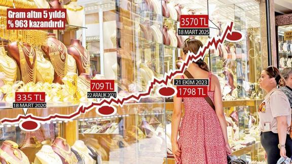 ABD Başkanı Donald Trump'ın öngörülemez hareketleri ve Ortadoğu'da yaşanan gerilim, altın fiyatlarında yeni bir rekorun kırılmasına neden oldu. Altının ons fiyatı 3 bin 15 doları, gram altın fiyatı ise 3 bin 570 liraya ulaştı. Uzmanlar altının ons fiyatında yukarı yönlü trendin devam etmesini beklerken gram altında ise yıl için 4 bin lira fiyat biçenler var. 18 Mart 2020'de 335 lira olan gram altının 5 yıllık getirisi yüzde 963 oldu.