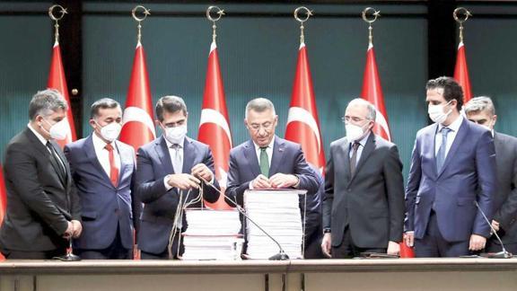 Fuat Oktay'ın açıklamalarının ardından geleneksel bütçe bağlama töreni yapıldı. Oktay, beraberindekilerle 2022 bütçesini bağladı.