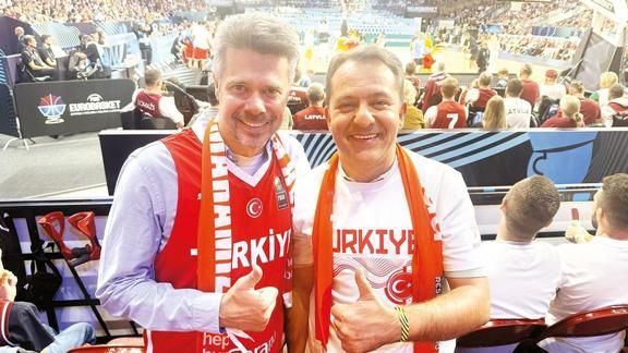 Cem Tanır (sağda) ve David Ferguson, Riga'daki Avrupa Şampiyonası'nda A Milli Erkek Basketbol Takımı'nın ev sahibi Letonya'yı 93-73 yendiği maçı birlikte izledi.