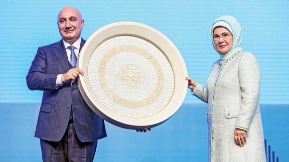 Emine Erdoğan, Halkbank'ın düzenlediği zirvede kadın girişimcilerle buluştu. Program sonunda Halkbank Genel Müdürü Osman Arslan, Emine Erdoğan'a hediye takdim etti.