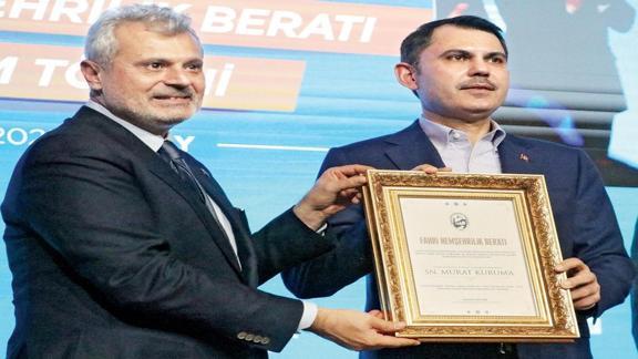 Büyükşehir Belediye Başkanı Mehmet Öntürk tarafından Bakan Kurum'a fahri hemşerilik beratı takdim edildi.