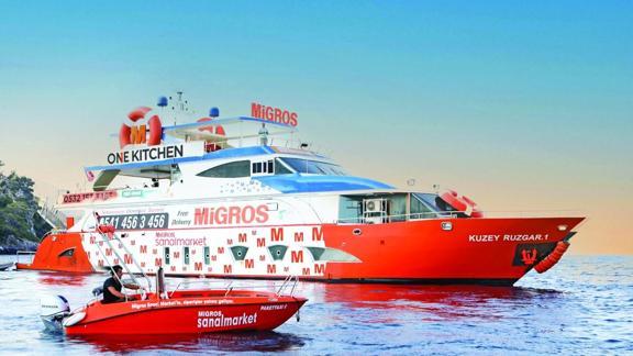 Migros Deniz Market, sezon süresince haftanın 7 günü Göcek'te bulunan adalara ve kara ulaşımı olmayan koylara hizmet götürecek. 45 metrelik uzunluğu ve 168 metrekarelik satış alanıyla süpermarketi denize taşıyan Migros Deniz Market'te paketli meyve-sebze, et ve şarküteri ürünlerinden, taze günlük ekmeğe, tekstil ürünlerinden deniz malzemelerine ve sıcak yaz günlerinin en önemli ihtiyacı olan buza kadar 3.500'den fazla ürün çeşidi satışa sunuluyor. Migros Deniz Market'le iletişime geçen müşterilerin mağazaya ulaşımı Migros tarafından botlarla sağlanıyor.
