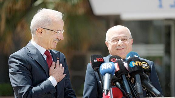 Ulaştırma ve Altyapı Bakanı Uraloğlu, Suriye Ulaştırma Bakanı Yarub Suleyman Bedir (sağda) ile Şam Uluslararası Havalimanı'nda basın açıklaması yaptı.