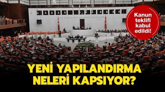 Vergi yapılandırma kanun teklifi yasalaştı. Kabul edilen yasaya göre, Vergi Usul Kanunu'nda yapılan değişiklikle Hazine ve Maliye Bakanlığı, Ticaret Bakanlığı, Sosyal Güvenlik Kurumu (SGK), il özel idareleri, belediyeler, Yatırım İzleme ve Koordinasyon Başkanlığına (YİKOB) olan bazı borçlar yapılandırılacak.