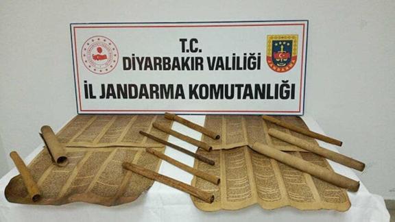 Diyarbakır'da İbranice yazılı el yazması parşömen kağıtları 1,5 milyon dolara satmaya çalışan kişilerle, kağıtları almaya çalışan şüpheliler, jandarma tarafından suçüstü yakalandı. Gözaltına alınan 5 kişiyle birlikte 13 parça İbranice el yazması parşömen kağıt ele geçirildi.