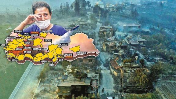 Antalya Manavgat'ta önceki gün 4 ayrı noktada başlayan orman yangınları kontrol altına alındı derken bu kez Akseki'de alevler yükseldi. Hasan Ali Yüksel (82) ile kapısı kilitli evde Osman ve Şehri Kardaş öldü. 183 kişi yangından etkilendi, tedavisi süren 15 kişiden 10'unun durumu ağır. Alevlerden kaçmak için Oymapınar Barajı'nda bindikleri teknenin yakıtı biten 10 kişi ile kapanan yolda mahsur kalan 13 kişi kurtarıldı. Çevre ve Şehircilik Bakanı Murat Kurum, Manavgat'ta 77 evin yandığını söyledi. Manavgat'ta 8 mahalle alevlere teslim oldu.