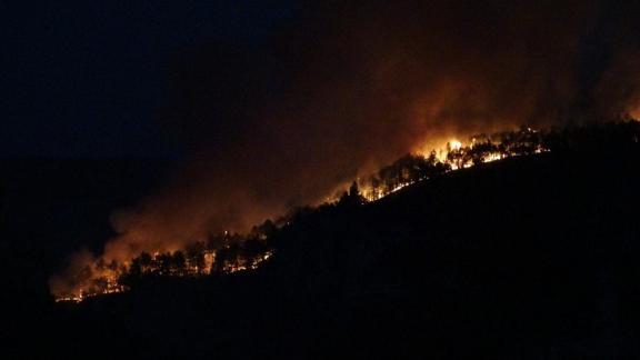 Yoğun dumanla kaplı bölgede, gündüz helikopter destekli yürütülen söndürme çalışmaları gece boyunca karadan sürdü.